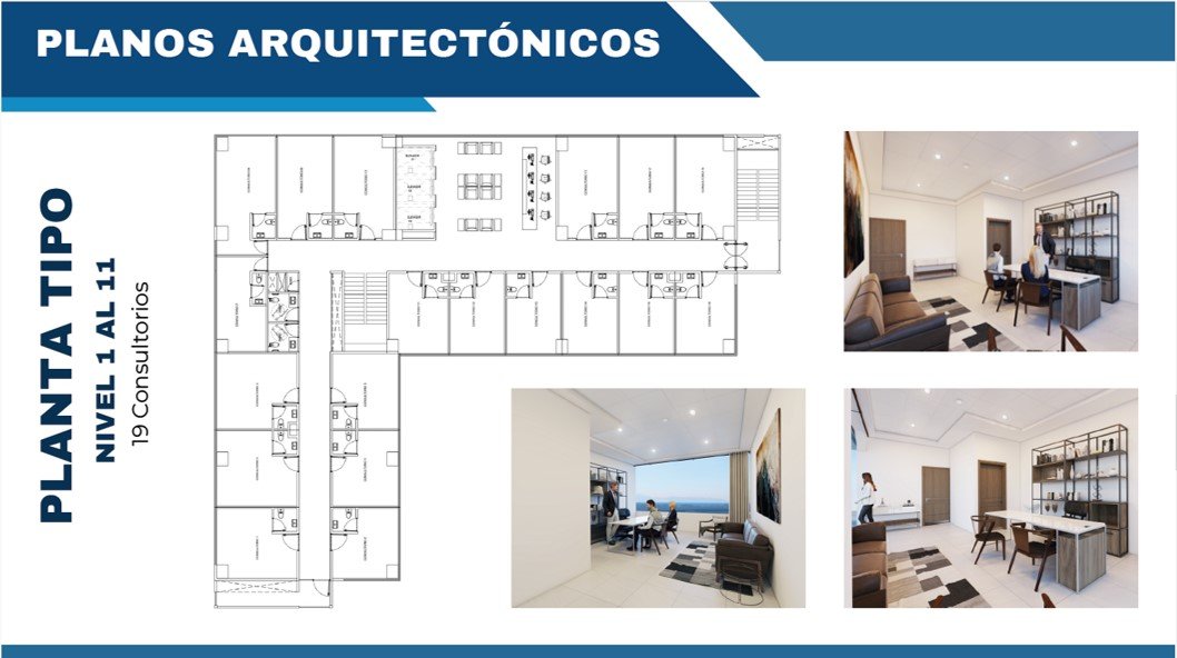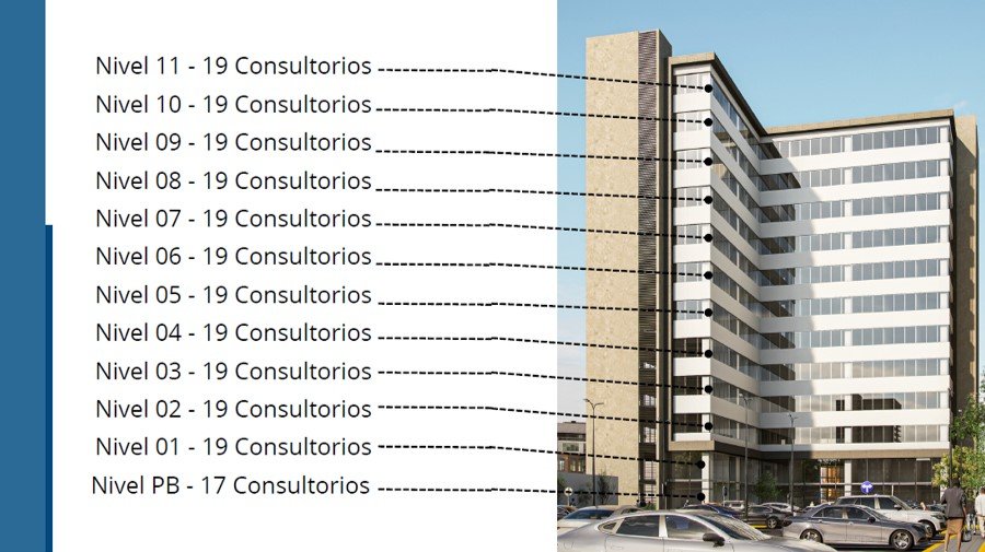 El edificio está diseñado con 11 niveles, planta baja tendrá 17 consultorios y a partir del primer piso 19 consultorios por nivel, resultando así un total de 226 consultorios.